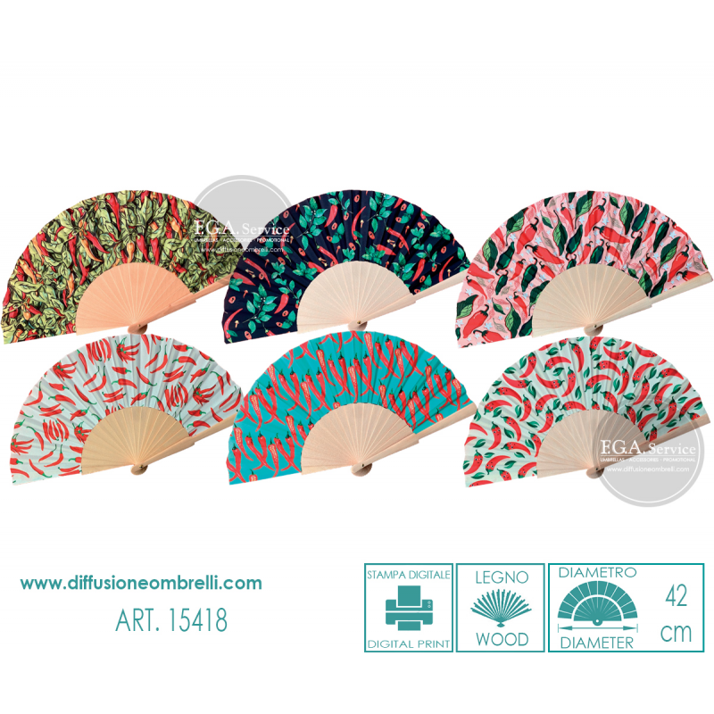 Ventaglio in legno e tessuto, fantasia peperoncini, 6 pezzi assortiti come in foto. Diametro 42 cm. La vendita di ventagli all'ingrosso è riservata a rivenditori del settore.