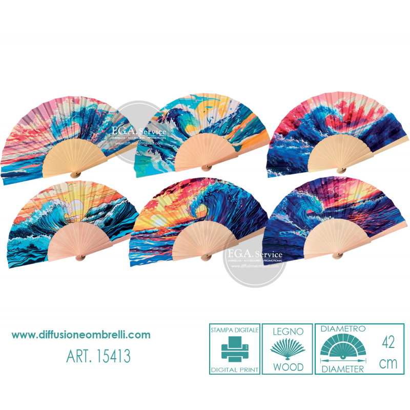 Ventaglio in legno e tessuto, fantasia Onde del Mare, 6 pezzi assortiti come in foto. Diametro 42 cm. La vendita di ventagli all'ingrosso è riservata a rivenditori del settore.