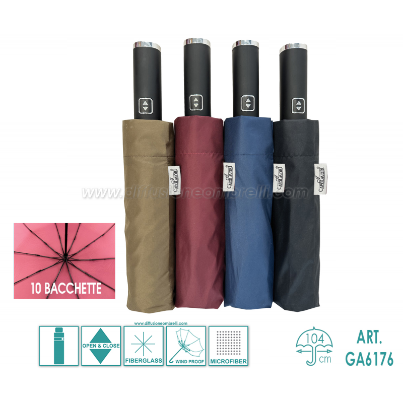 Ombrello Uomo Pieghevole, I Capolavori, 10 Bacchette in Fiberglass da 56 cm, Apertura Apri e Chiudi con Pulsante, Tinta Unita, Sistema Antivento, Tessuto Microfibra.