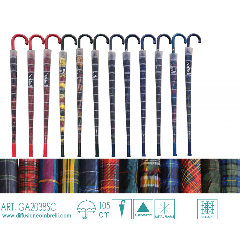 Ombrello Unisex con Raccogligocce, 8 Stecche da 61 cm, Apertura Automatica con Pulsante, Struttura, Puntale e Asta in Metallo, Fantasia Scozzese, Impugnatura Curva in PVC in Tinta, Tessuto Nylon. Vendita B2B di ombrelli in Italia e in Europa, riservata a rivenditori del settore.