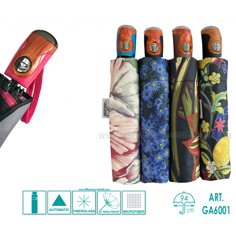 Ombrello Donna I Capolavori, Mini Richiudibile, 8 Stecche da 54 cm, Apertura Automatica con Pulsante, Asta in 3 Sezioni, Modello Tondo, Fantasia, Struttura Antivento Rinforzata con Fibra di Vetro, con Puntine Fissate e Arrotondate che Rendono l'Ombrello più Sicuro e Robusto, Tessuto Microfibra Idrorepellente. Vendita B2B di ombrelli in Italia e in Europa, riservata a rivenditori del settore.