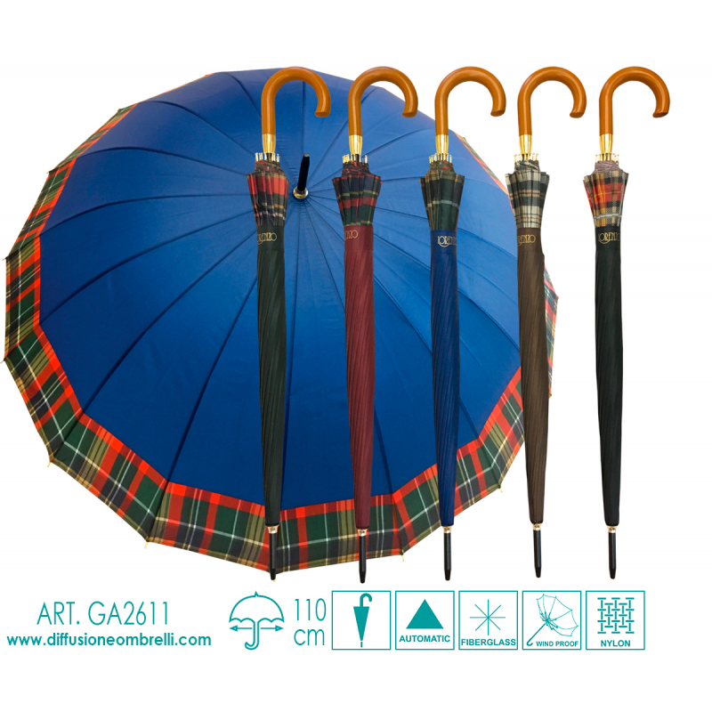 Ombrello Grande Multistecche Unisex, 16 stecche da 65 cm in Fiberglass, Apertura Automatica con Pulsante, Asta in Metallo nero, Impugnatura in plastica, Tinta Unita con Fascia Scozzese, Tessuto Nylon. Vendita B2B di ombrelli in Italia e in Europa, riservata a rivenditori del settore.