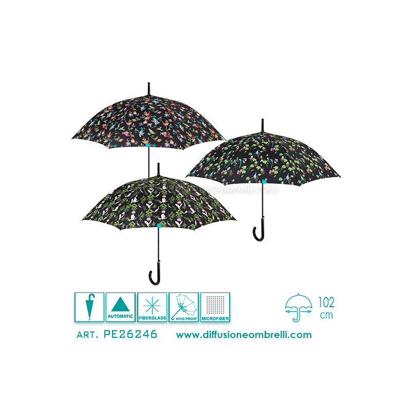 Ombrello Donna Classico, 8 Stecche da 61 cm con Apertura Automatica in nero con Fantasia botanica, Antivento, Tessuto Microfibra.