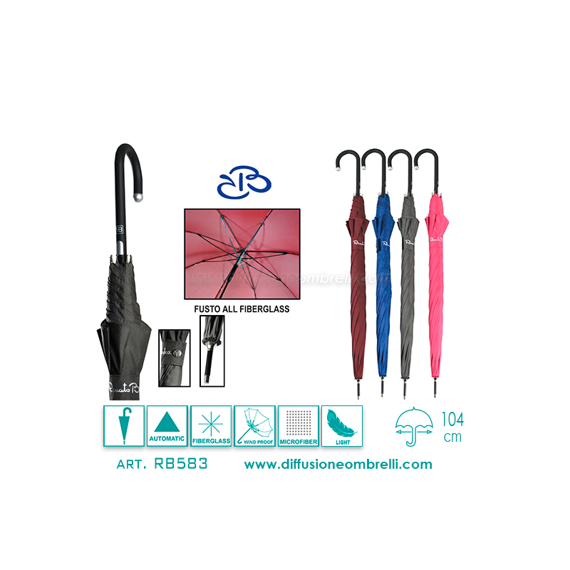 Ombrello donna classico, 8 stecche da 60 cm in fiberglass, struttura antivento in fiberglass, apertura automatica con pulsante, colore unito tessuto in microfibra, impugnatura curva sottile. Renato Balestra