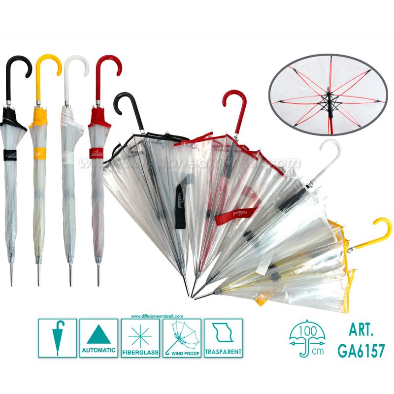 Ombrello Donna Classico Trasparente con Bordino colorato e impugnatura curva in Tinta, i Capolavori, 8 bacchette in fiberglass da 60 cm, Tessuto POE, Apertura Automatica con Pulsante, Struttura Antivento.