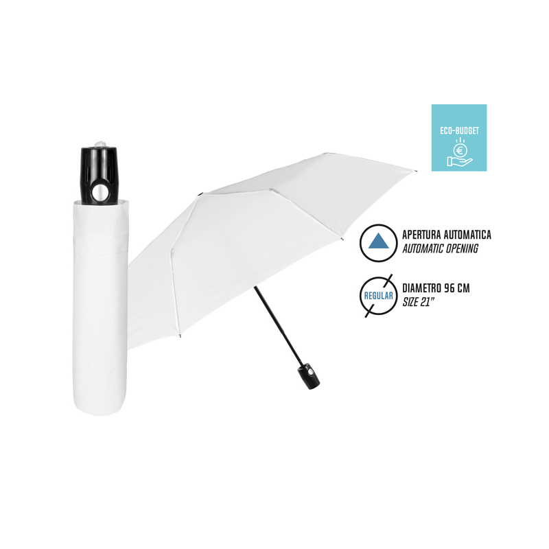 Ombrello pieghevole con apertura automatica, 8 bacchette in fiberglass da 54 cm, diametro aperto: 96 cm. Tessuto Nylon Bianco