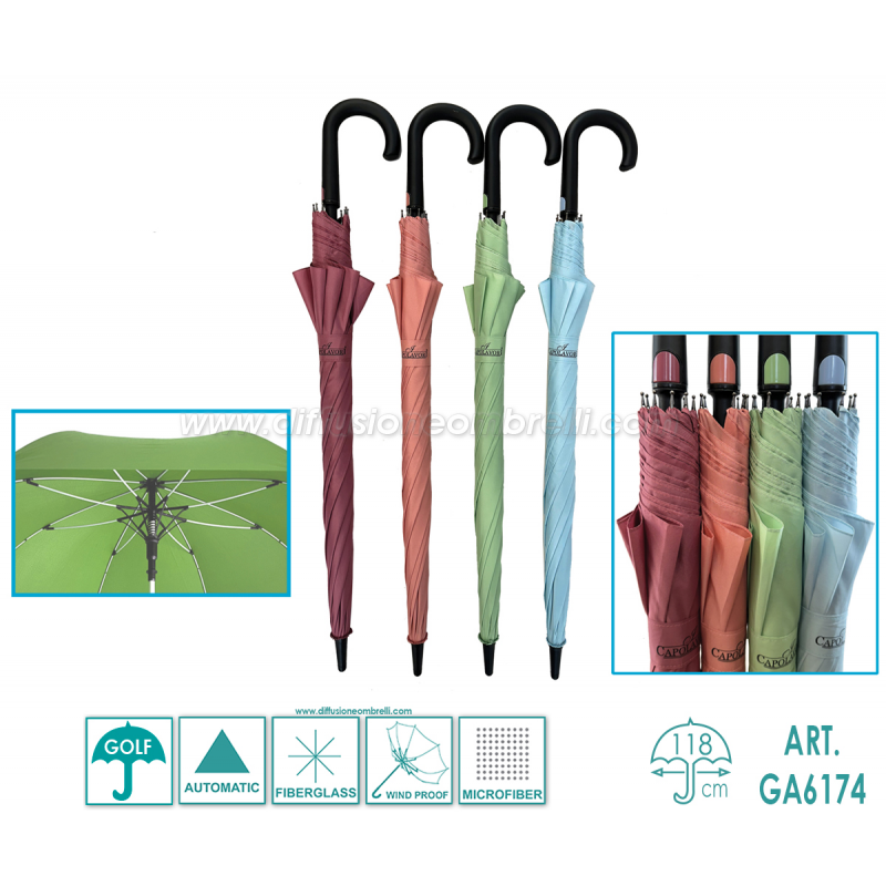 Ombrello Donna Golf, I Capolavori, 8 Bacchette in fiberglass da 70 cm, Struttura Antivento, Tinta Unita Pastello, Particolari in tinta, Tessuto Microfibra, Apertura Automatica con Pulsante, L'ombrello è abbastanza grande da ospitare due persone.