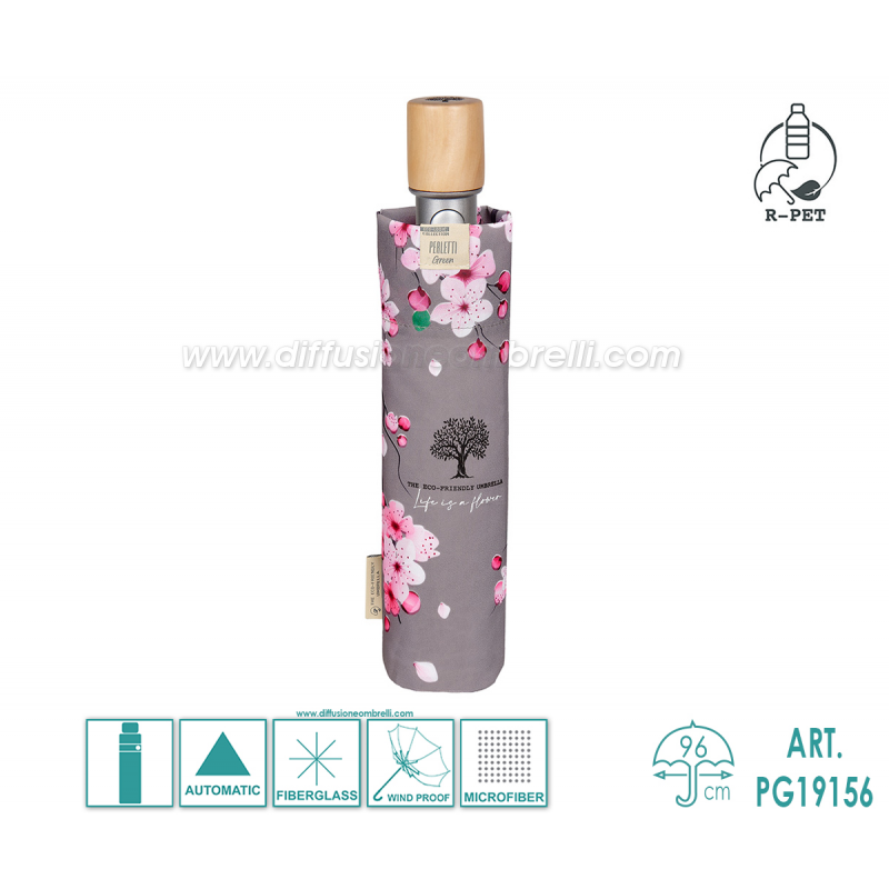 Ombrello Perletti Green Donna Pieghevole, 8 Bacchette da 54 cm in Fiberglass, Apertura Automatica con Pulsante, Asta in 3 Sezioni, Fantasia fiore di pesco, Sistema Antivento, Tessuto in Microfibra ad Alta Resinatura Riciclato