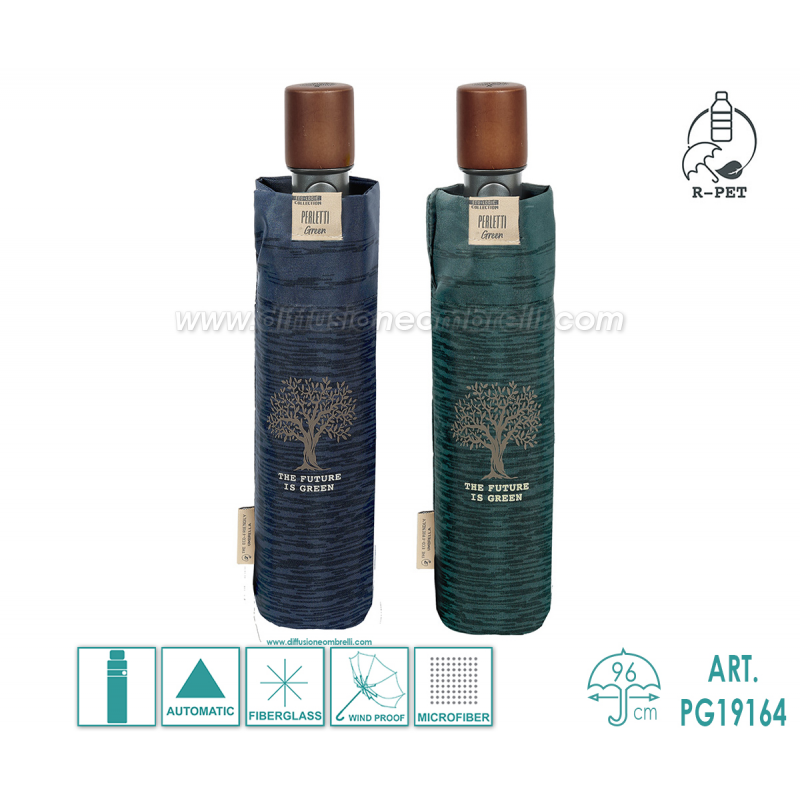Ombrello Perletti Green Uomo Pieghevole, 8 Bacchette da 54 cm in Fiberglass, Apertura Automatica con Pulsante, Asta in 3 Sezioni, Fantasia bicolore, Sistema Antivento, Tessuto in Microfibra ad Alta Resinatura Riciclato