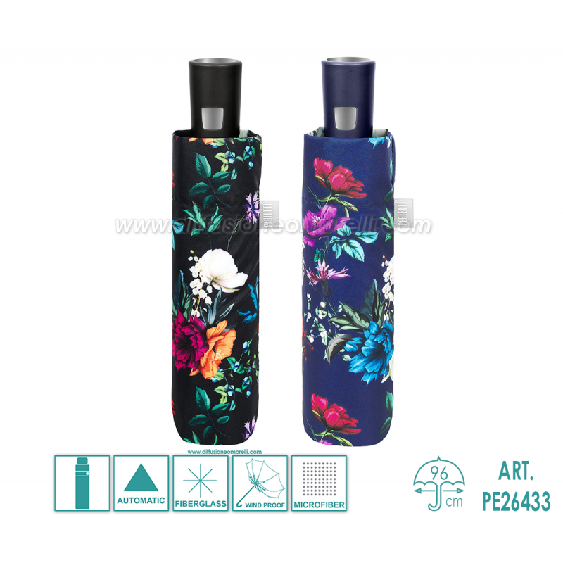 Ombrello Perletti Time Donna Pieghevole, 8 Bacchette da 54 cm in Fiberglass, Apertura Automatica con Pulsante, Asta in 3 Sezioni, Fantasia fiori, Sistema Antivento, Tessuto in Microfibra ad Alta Resinatura
