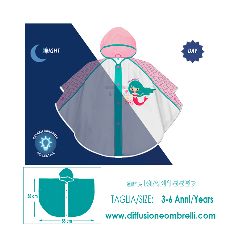 Poncho con stampa sirenetta in EVA Impermeabile con bordino catarifrangente - Indicato per l'età di 3/6 anni. Vendita all'ingrosso.
