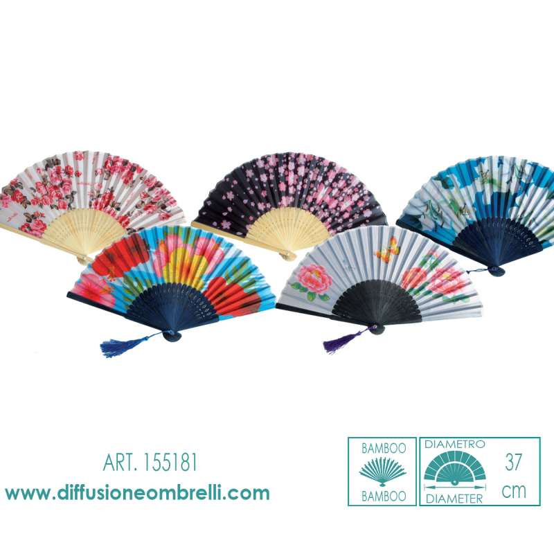 Ventagli in tessuto fantasia fiori e manico in bamboo, assortiti 1 per colore come in foto. Diametro 37 cm. La vendita all' ingrosso ventagli è riservata a rivenditori del settore.