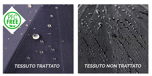 Tessuto a trama fitta con speciale resinatura idrorepellente e super impermeabile ad asciugatura rapida. PFCFREE non significa solo l’utilizzo di un tessuto impermeabile eco-compatibile e privo di sostanze tossiche, ma anche prestare attenzione alla salute e all’ambiente per un futuro eco-sostenibile.