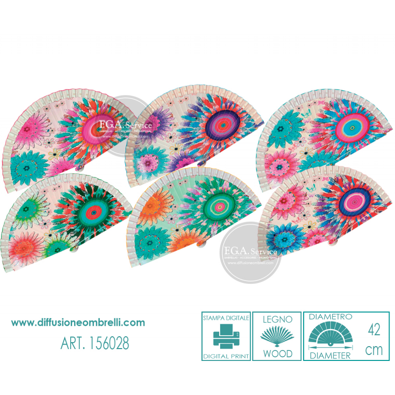 Ventaglio in legno laccato con stampa digitale fantasia disigual, con bordino in tessuto. 6 pezzi assortiti come in foto. Diametro 42 cm. La vendita di ventagli all'ingrosso è riservata a rivenditori del settore.