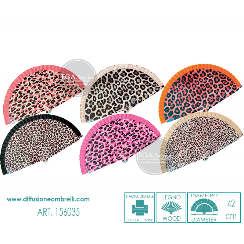 Ventaglio in legno laccato con stampa digitale fantasia Animalier maculato, con bordino in tessuto. 6 pezzi assortiti come in foto. Diametro 42 cm. La vendita di ventagli all'ingrosso è riservata a rivenditori del settore.