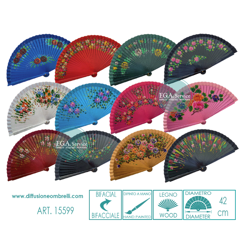 Ventaglio Bifacciale in legno laccato, fantasia fiori dipinti a mano su entrambi i lati, assortimento di 12 pezzi 1 per fantasia come in foto. Diametro 42 cm. La distribuzione all'ingrosso di ventagli è riservata ai soli rivenditori.