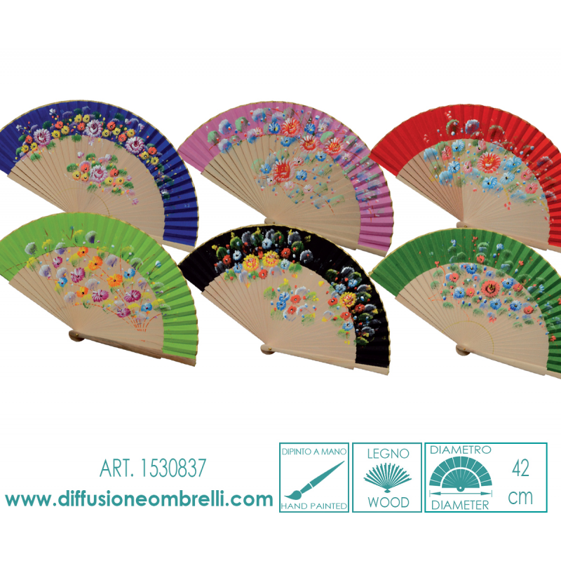 Ventagli in legno laccato con bordo in tessuto e fiori dipinti a mano, assortimento di 12 fantasie come in foto. Diametro 42 cm. La vendita all' ingrosso ventagli è riservata a rivenditori del settore.