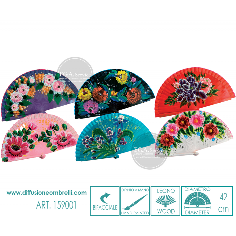Ventaglio in legno laccato e fiori dipinti a mano, bifacciale, con bordino in tessuto. 6 Pezzi assortiti come in foto. Diametro 42 cm. La vendita di ventagli all'ingrosso è riservata a rivenditori del settore.