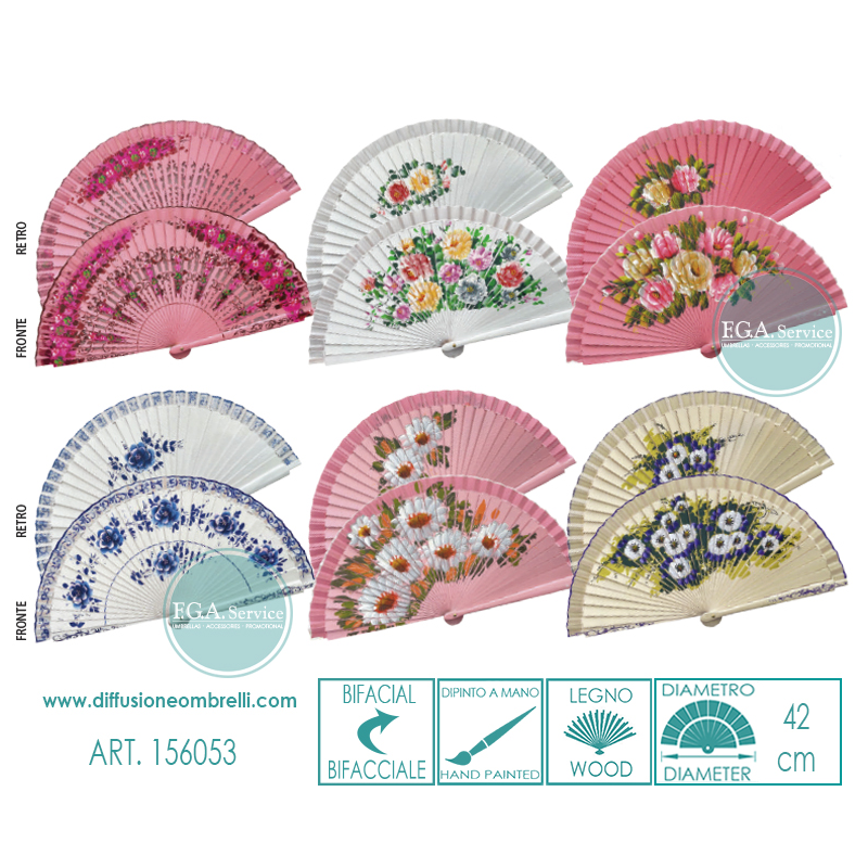 Ventaglio Bifacciale in legno laccato, fantasia fiori dipinti a mano su entrambi i lati in modo diverso, assortimento di 6 pezzi 1 fantasia come in foto, stecche intarsiate. Diametro 42 cm. La distribuzione all'ingrosso di ventagli è riservata ai soli rivenditori.