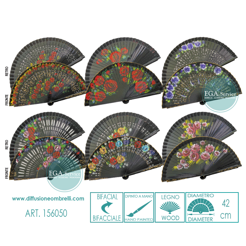 Ventaglio Bifacciale in legno laccato, fantasia fiori dipinti a mano su entrambi i lati in modo diverso, assortimento di 6 pezzi 1 fantasia come in foto, stecche intarsiate. Diametro 42 cm. La distribuzione all'ingrosso di ventagli è riservata ai soli rivenditori.