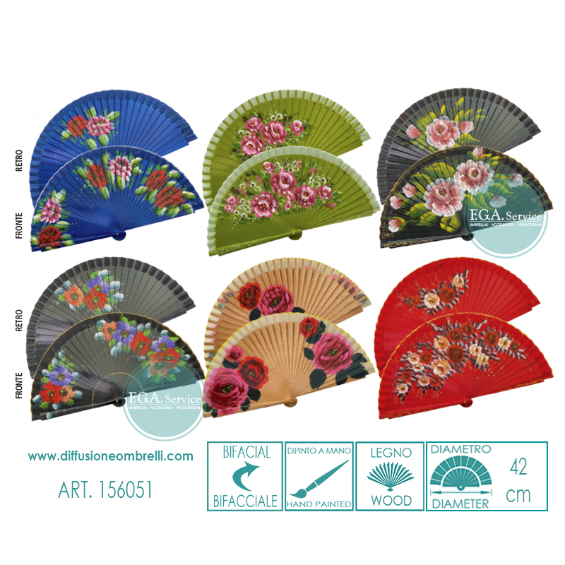 Ventaglio Bifacciale in legno laccato, fantasia fiori dipinti a mano su entrambi i lati in modo diverso, assortimento di 6 pezzi 1 fantasia come in foto, stecche intarsiate. Diametro 42 cm. La distribuzione all'ingrosso di ventagli è riservata ai soli ri