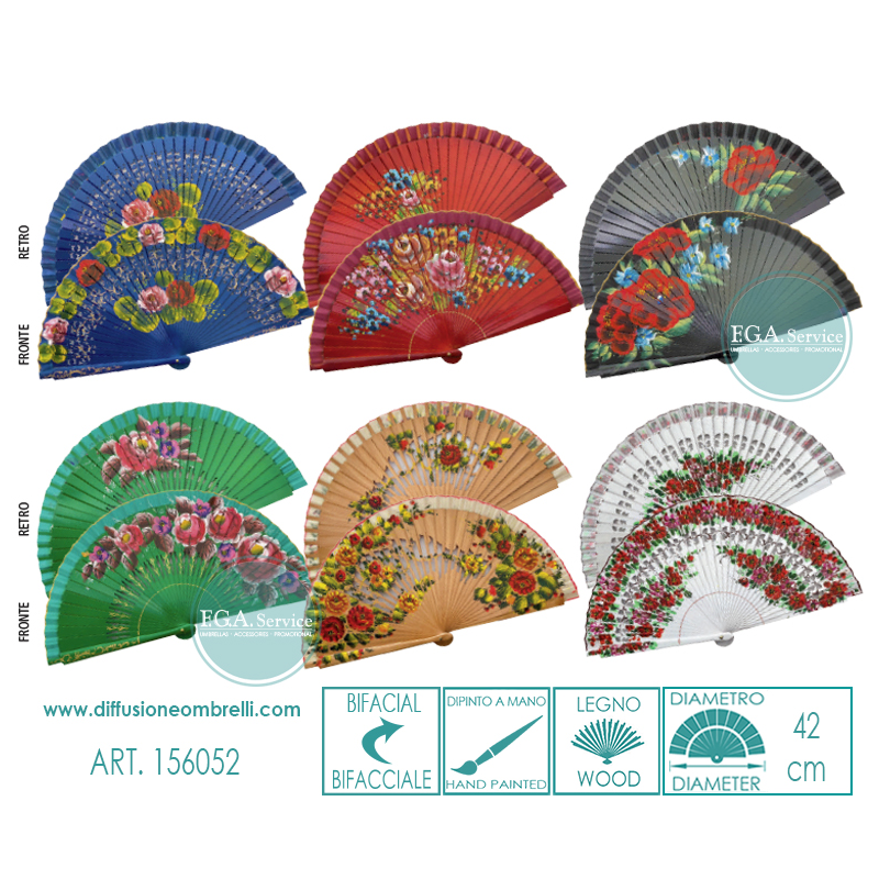 Ventaglio Bifacciale in legno laccato, fantasia fiori dipinti a mano su entrambi i lati in modo diverso, assortimento di 6 pezzi 1 fantasia come in foto, stecche intarsiate. Diametro 42 cm. La distribuzione all'ingrosso di ventagli è riservata ai soli rivenditori.