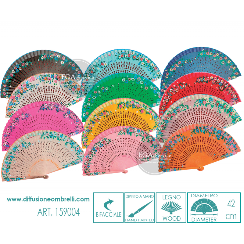 Ventaglio in legno traforato, con fantasia fiori dipinti a mano, bifacciale e bordino in tessuto. 12 pezzi assortiti come in foto. Diametro 42 cm. La vendita di ventagli all'ingrosso è riservata a rivenditori del settore.