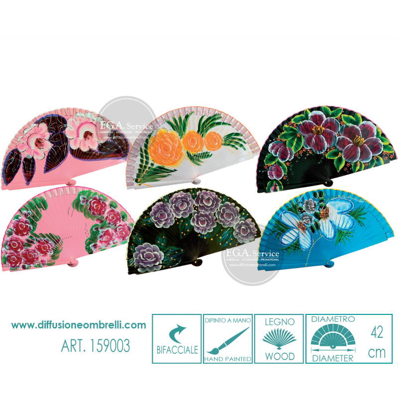 Ventaglio in legno laccato e fiori dipinti a mano, bifacciale, con bordino in tessuto. 6 Pezzi assortiti come in foto. Diametro 42 cm. La vendita di ventagli all'ingrosso è riservata a rivenditori del settore.