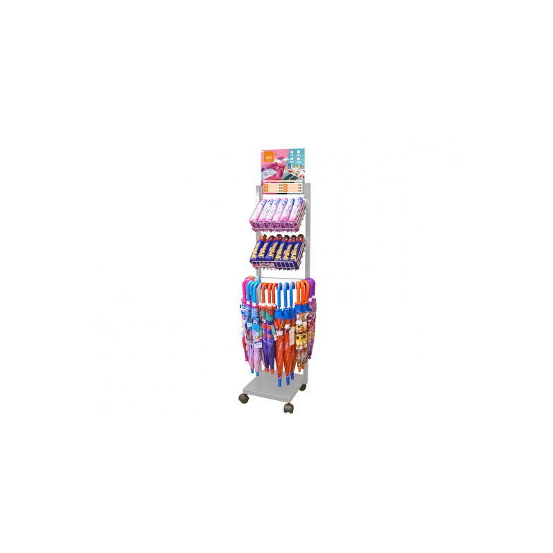 Espositore quadrato in ferro 24 ombrelli lunghi+24 ombrelli mini da bambino. Misure espositore 34x34x165 cm. L'espositore viene venduto vuoto.