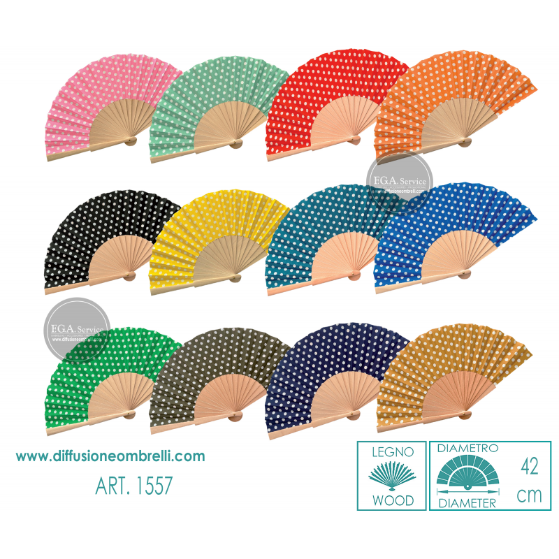 Ventagli in tessuto fantasia pois e manico in legno,assortimento da 12 pz come in foto. Diametro 42 cm. La vendita all' ingrosso ventagli è riservata a rivenditori del settore.