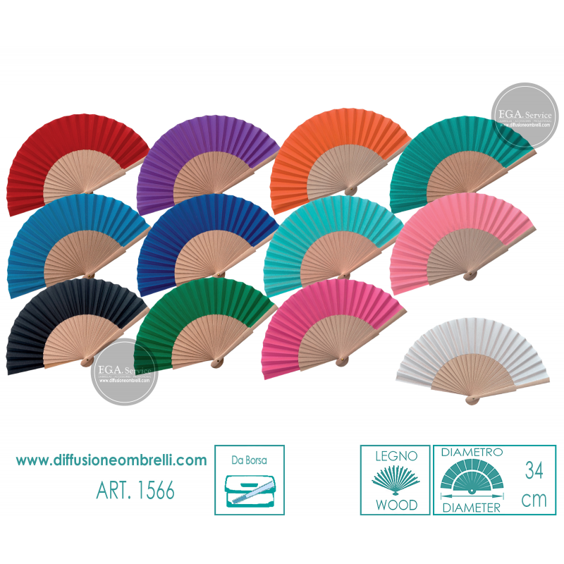 Ventaglio in legno e tessuto, misura da borsetta, tinta unita, 12 pezzi assortiti come in foto. Diametro 34 cm. La vendita di ventagli all'ingrosso è riservata a rivenditori del settore.