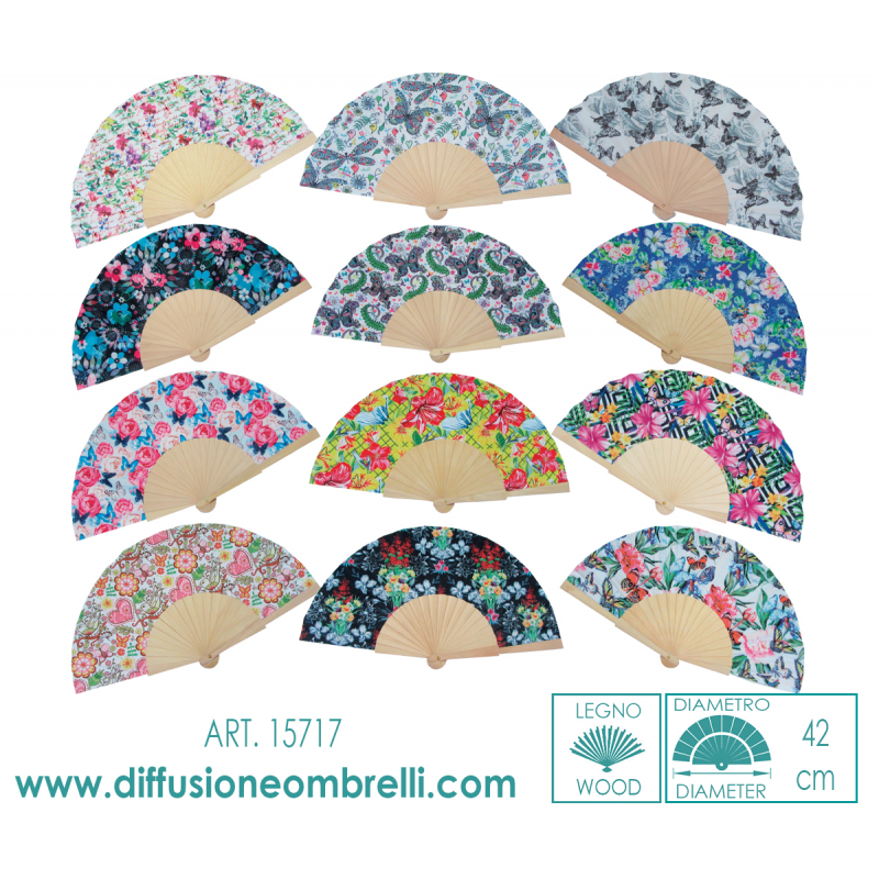 Ventagli in tessuto fantasia farfalle e manico in legno, 12 pz assortiti 1 per colore come in foto. Diametro 42 cm. La vendita all' ingrosso ventagli è riservata a rivenditori del settore.
