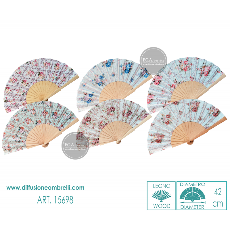 Ventagli in tessuto fantasia fiori, tessuto damascato e manico in legno, assortiti 1 per colore come in foto. Diametro 42 cm.