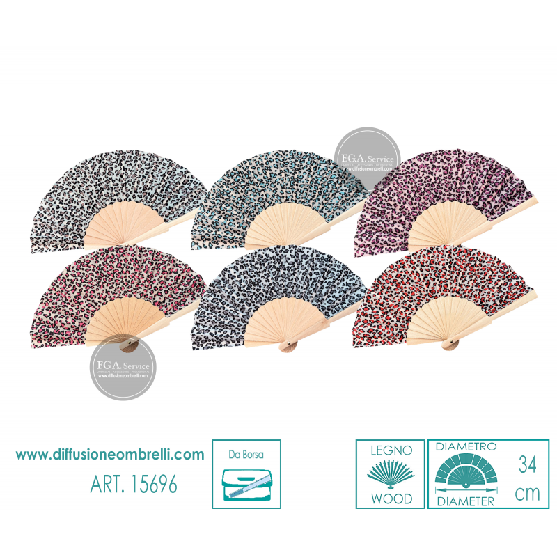 Ventagli in legno e bordo in tessuto fantasia maculata, assortiti 1 per colore come in foto. Diametro 42 cm. La vendita all' ingrosso ventagli è riservata a rivenditori del settore.