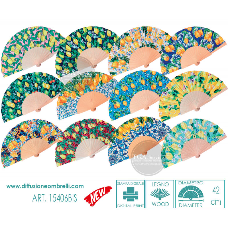 Ventaglio diametro cm 42 legno e tessuto, stampe agrumi con limoni, confezione da 12 pz, assortiti come da immagine, prezzo ingrosso riservato a rivenditori