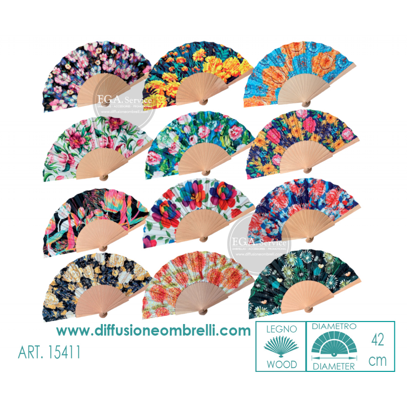 Ventaglio diametro cm 42 legno e tessuto, stampe fantasie fiori, confezione da 12 pz, assortiti come da immagine, prezzo ingrosso riservato a rivenditori