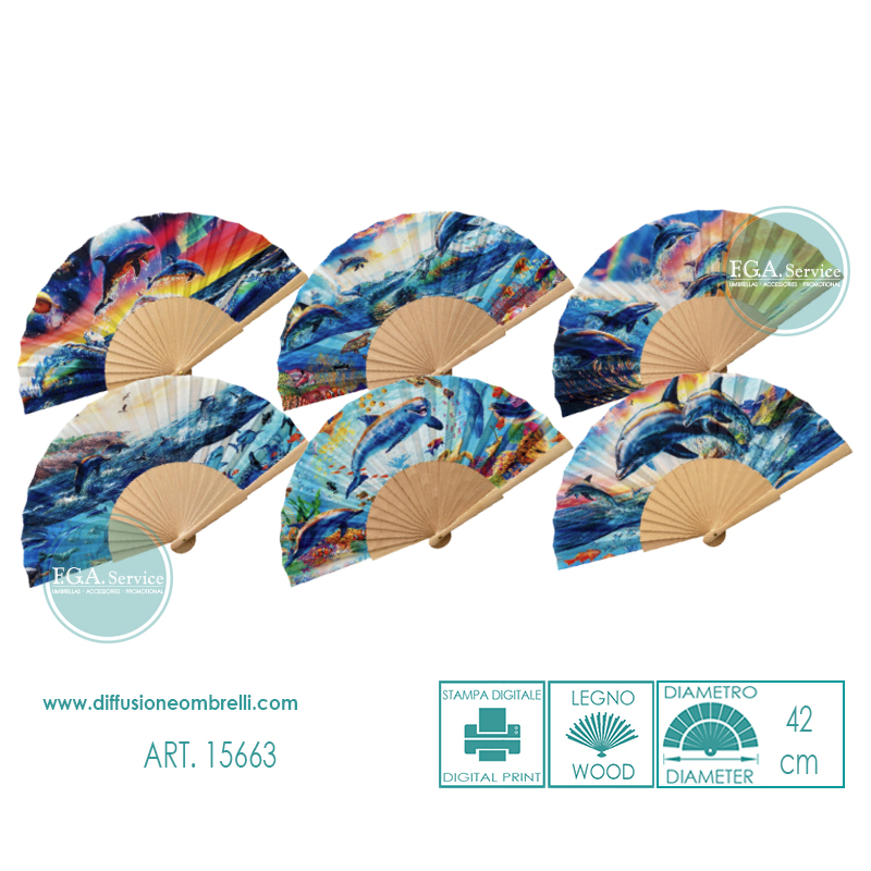 Ventaglio diametro cm 42 legno e tessuto, stampe fantasie delfini, confezione da 6 pz, assortiti come da immagine, prezzo ingrosso riservato a rivenditori