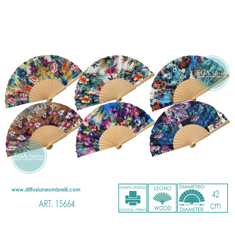 Ventaglio diametro cm 42 legno e tessuto, stampe fantasie fiori, confezione da 6 pz, assortiti come da immagine, prezzo ingrosso riservato a rivenditori