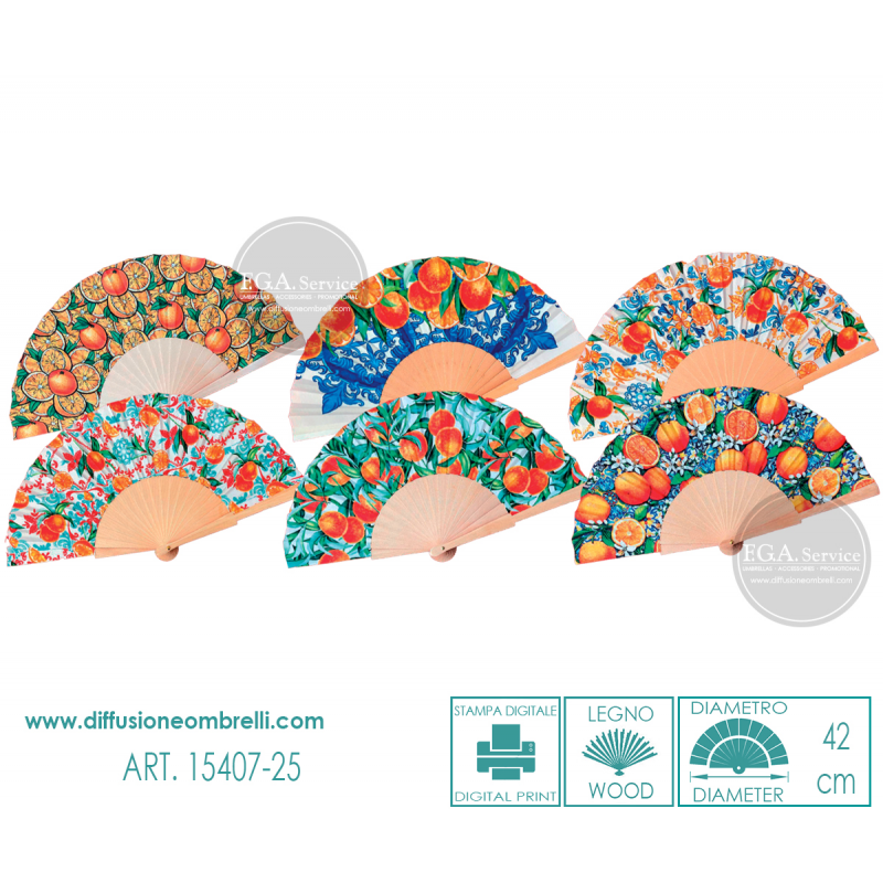 Ventaglio in legno e tessuto, fantasia Arancia, 6 pezzi assortiti come in foto. Diametro 42 cm. La vendita di ventagli all'ingrosso è riservata a rivenditori del settore.