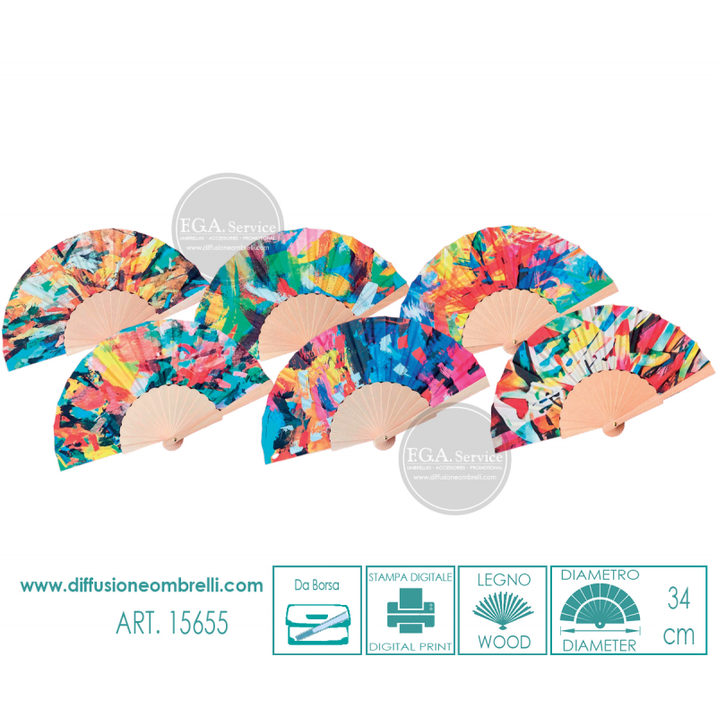 Ventaglio da borsetta in legno e tessuto, fantasia astratta, 6 pezzi assortiti come in foto. Diametro 34 cm. La vendita di ventagli all'ingrosso è riservata a rivenditori del settore.