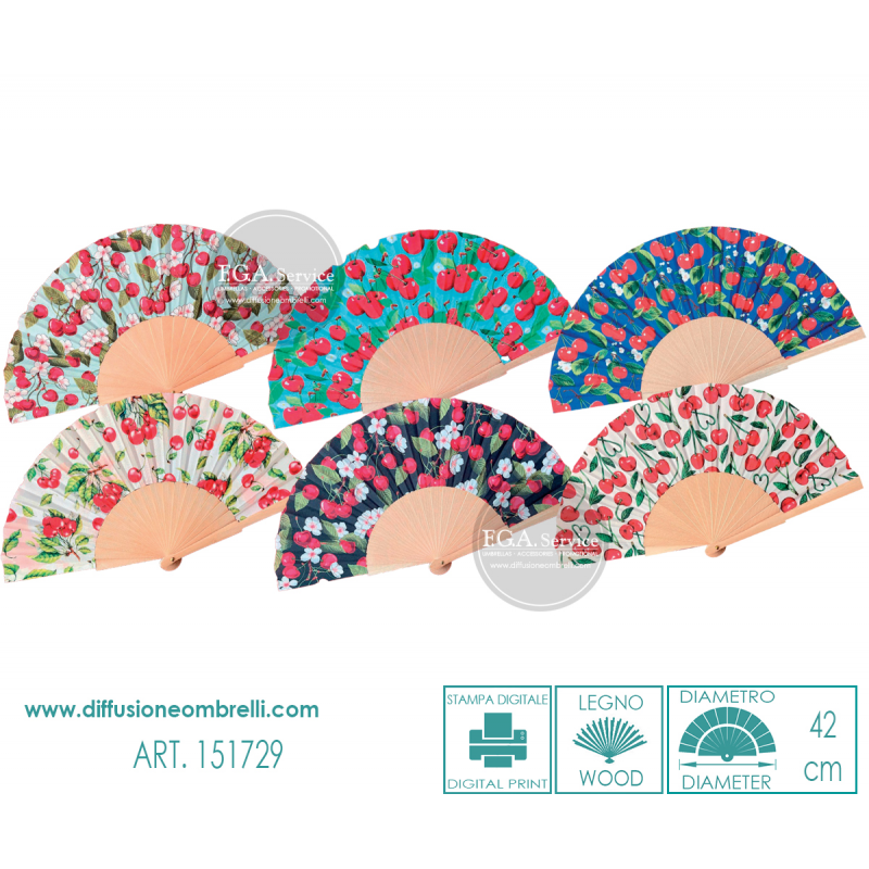 Ventaglio in legno e tessuto, fantasia Ciliege, 6 pezzi assortiti come in foto. Diametro 42 cm. La vendita di ventagli all'ingrosso è riservata a rivenditori del settore.