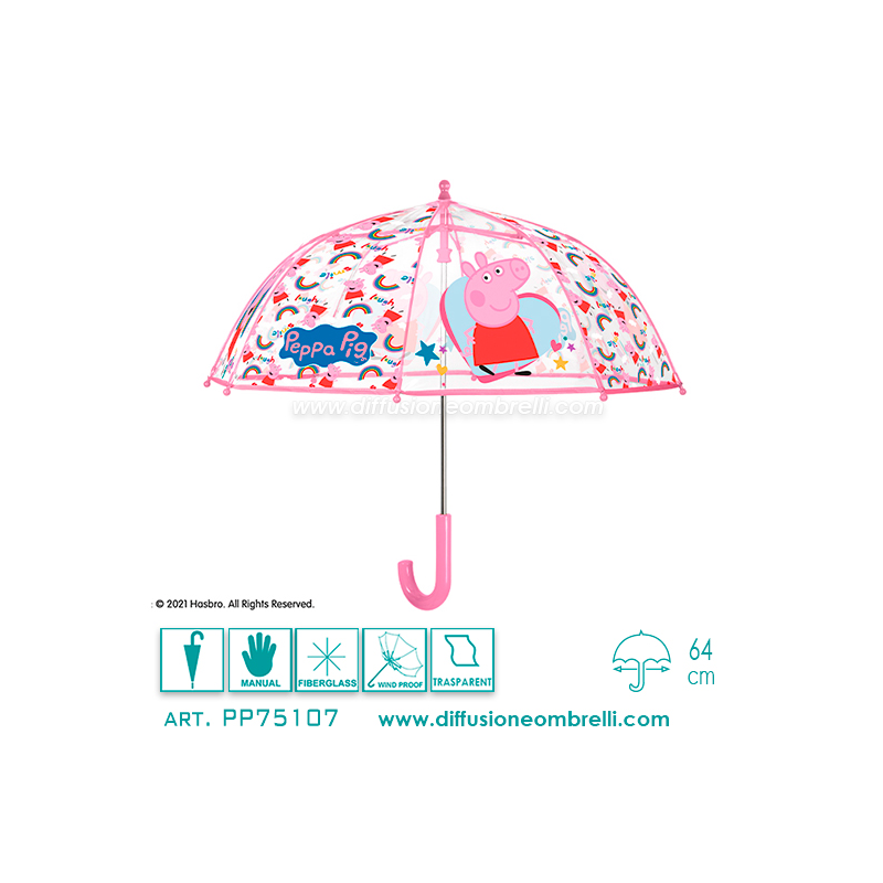 Ombrello Bimba 8 Stecche da 42 cm con Apertura Manuale in cupola POE trasp. con stampe Peppa Pig Sistema di Apertura Sicura.