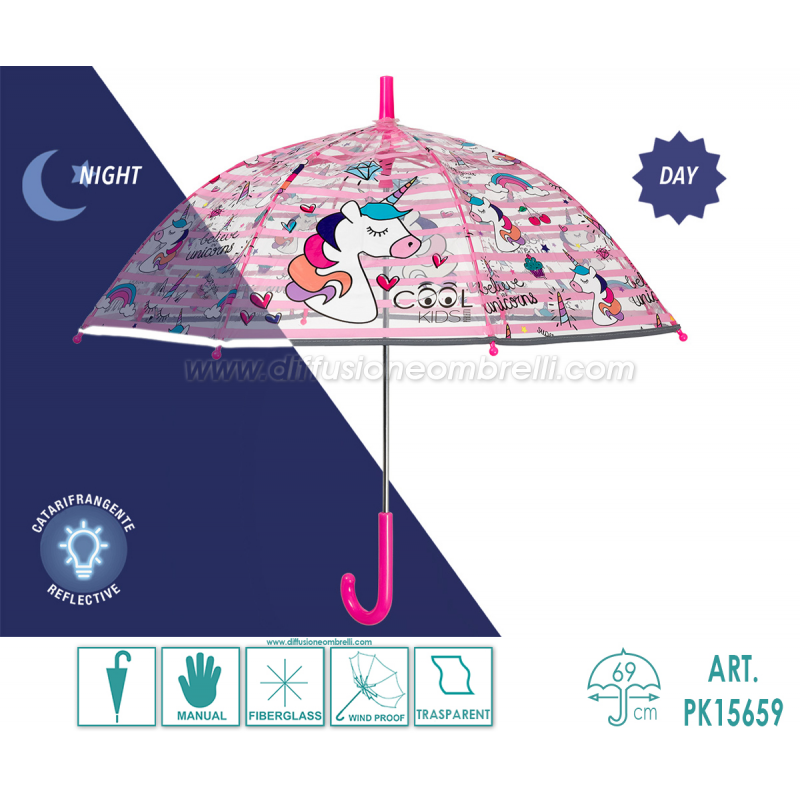 Ombrello Bimba, 8 Bacchette da 45 cm in Fiberglass, Lungo con Apertura Manuale, Cupola POE Trasparente, unicorno con dettagli catarifrangenti, Sistema Antivento