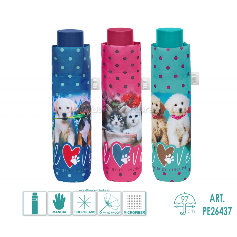 Ombrello Perletti Time Donna Pieghevole, 8 Bacchette da 54 cm in Fiberglass, Apertura Manuale, Asta in 3 Sezioni, stampa cani e gatti, Sistema Antivento, Tessuto in Microfibra ad Alta Resinatura