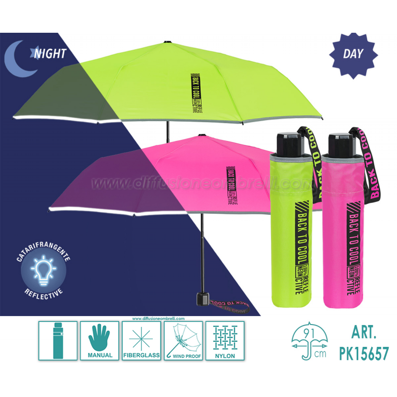 Ombrello Unisex Perletti Cool Kids Pieghevole, 8 Bacchette da 50 cm in Fiberglass, Apertura Manuale, Asta in 3 Sezioni, verde/fuchsia fluo con dettagli catarifrangenti, Sistema Antivento