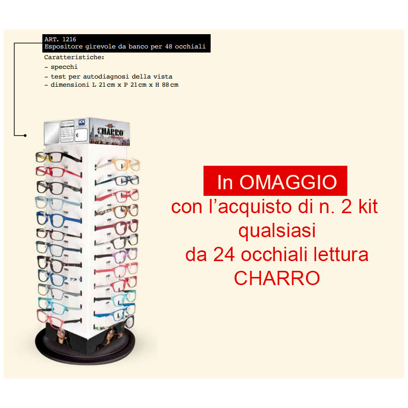 Pratico e comodo espositore da banco girevole, per l'esposizione di 48 occhiali da lettura Charro. L'espositore viene omaggiato, su richiesta, con l'acquisto di 2 kit da 24 occhiali da lettura charro.