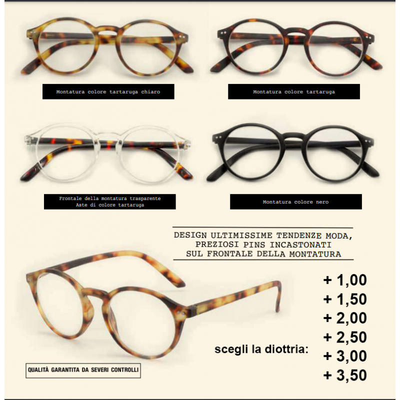 Confezione ricarica contenente n. 4 occhiali dello stesso modello, stessa diottria, nei 4 diversi colori. Esclusi astuccio e cordicella. Vendita riservata all'ingrosso per rivenditori del settore.
