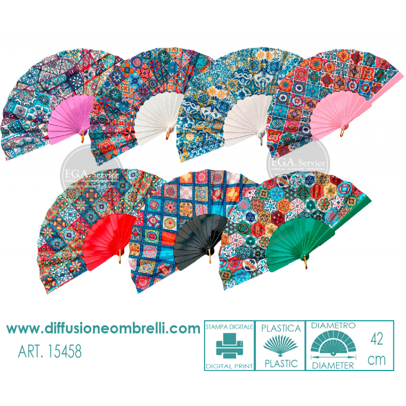 Ventaglio plastica e tessuto, stampe maioliche, Pz. 12 assortimento colore come da foto, prezzo ingrosso riservato a rivenditori