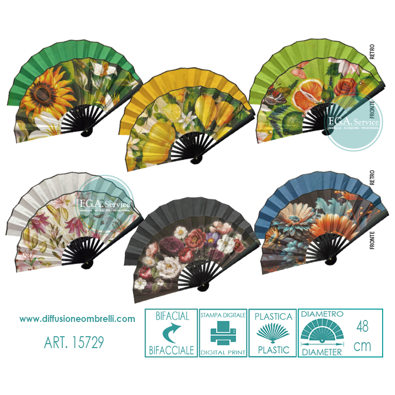 Ventaglio grande con 14 stecche in plastica e stampe floreali, tessuto bifacciale. 12 stampe floreali sul fronte e 12 tinte unite abbinate sul retro. Diametro 48 cm