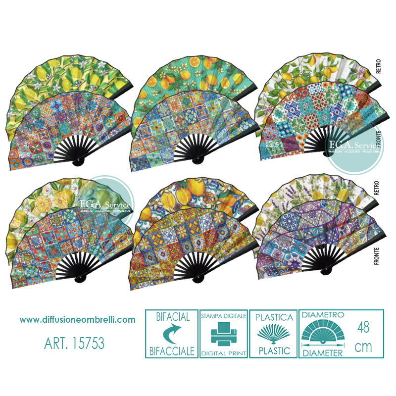 Ventaglio grande con 14 stecche in plastica e stampe limoni, tessuto bifacciale. 12 stampe limoni sul fronte e 12 stampe maioliche sul retro. Diametro 48 cm